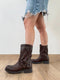 "TUNDA é uma plataforma adornada com fivelas e tachas, feita de couro ecológico. Possui salto de 5 cm que oferece elegância discreta e conforto inigualável. A circunferência do tornozelo é de 28cm e a altura da bota é de 18,5cm, garantindo um ajuste perfeito e regular. “TUNDA” representa a escolha ideal para quem procura um calçado que alie estilo e conforto.